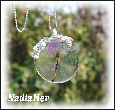 Voilà un pendentif en résine epoxy avec une rose séchée, que j'ai monté en pendentif avec un wire wapping, un travail de métal tissé.